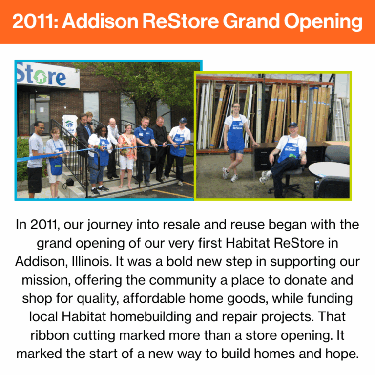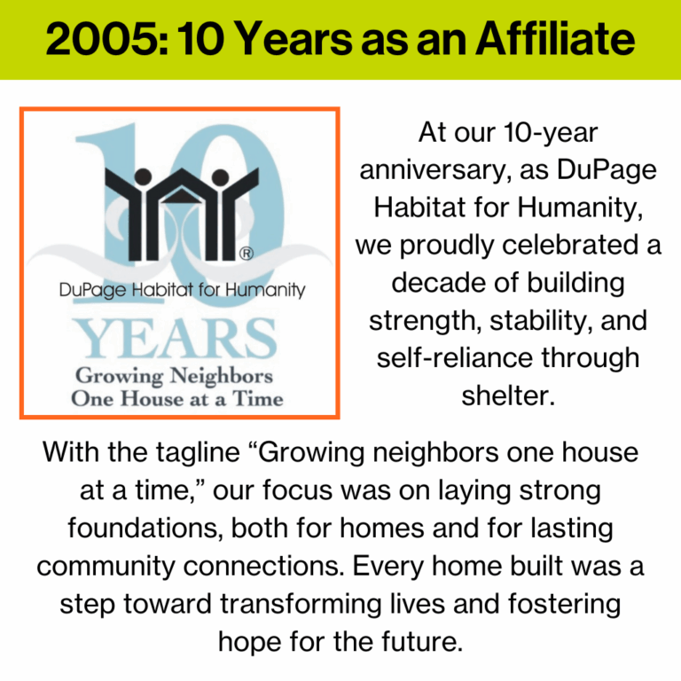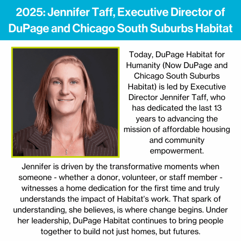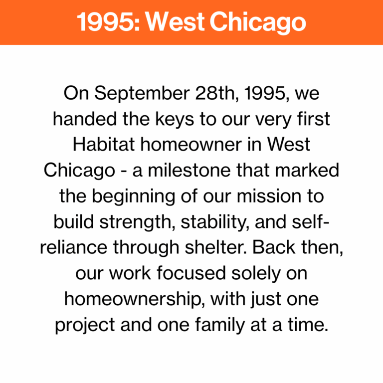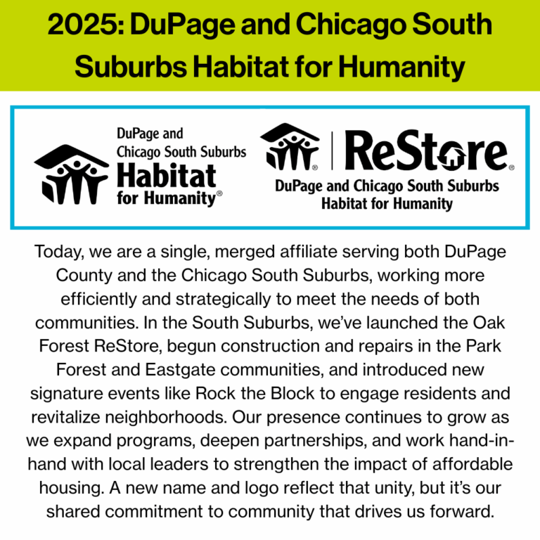 Celebrating the past and building the future, DuPage and Chicago South Suburbs Habitat for Humanity reflects on 30 years of growth, leadership, and community impact – from our first groundbreaking in West Chicago to the accomplishments and people who shaped our journey, as we prepare to break ground once again and continue building hope for generations to come.